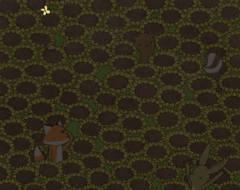 Эта картинка переносит нас на большое поле подсолнухов, где играют маленькие животные - мишка, енот, лиса и заяц и маленькая птичка. Главная задача заключается в том, чтобы найти еще одного "игрока" - а именно маленькую бабочку, которая спряталась между цветками. Для этого вам дается всего 20 секунд. Успейте решить эту задачу и проверьте свои возможности.