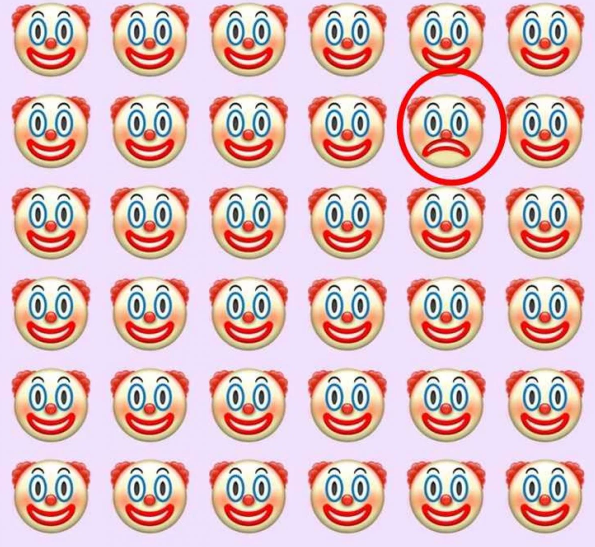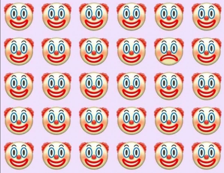 Удалось ли вам найти расстроенный смайлик? Он изображен справа в верхнем углу изображения. У клоуна отличается улыбка от других – она грустная.