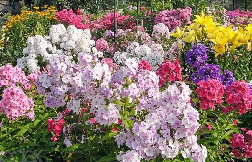 Растение формирует компактный куст (до 60 см высотой), а его цветы могут быть как обычными, так и махровыми, с разной окраской – от однотонного до узорных вариантов. Продолжительность цветения зависит от сорта и времени посадки, но можно подобрать флоксы так, чтобы они цвели непрерывно до середины осени.