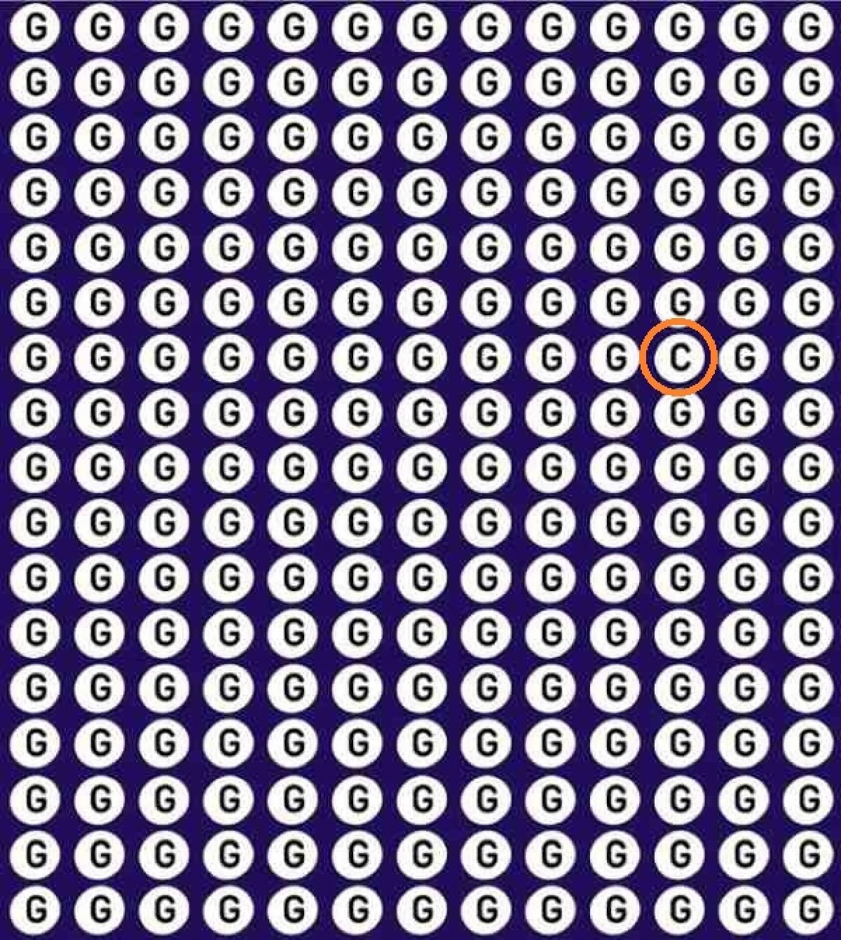 На картинке изображено большое количество букв G в кружочках – они расположены в столбцы и строки. Поначалу может показаться, что кроме них нет больше ничего, но на самом деле это не так. Не теряйте времени, а сразу приступайте к поискам нужной буквы.