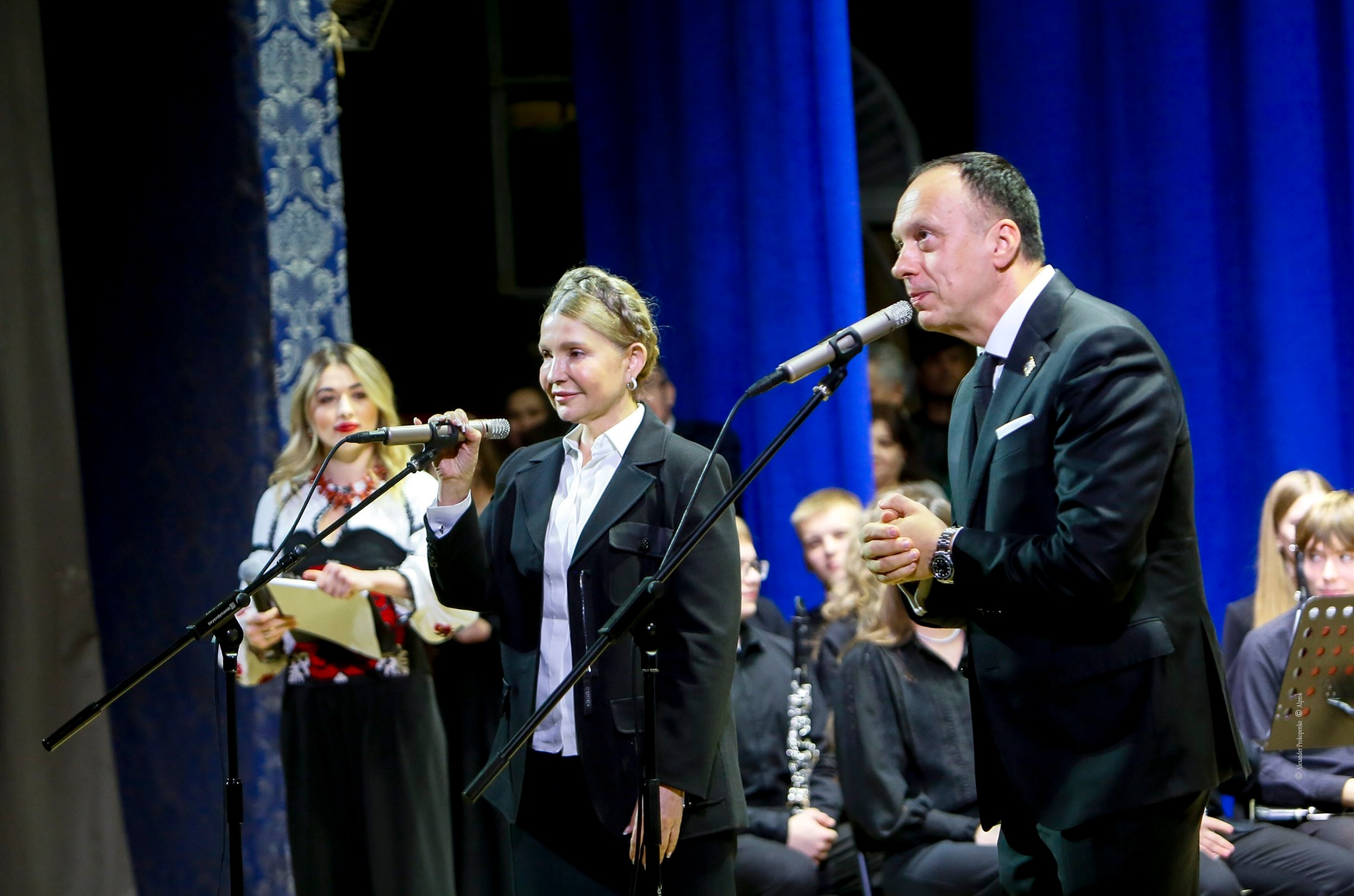 В этот раз Юлия Тимошенко не перегружала образ сложными укладками, а просто распустила русые косы, немного подкрутив их.