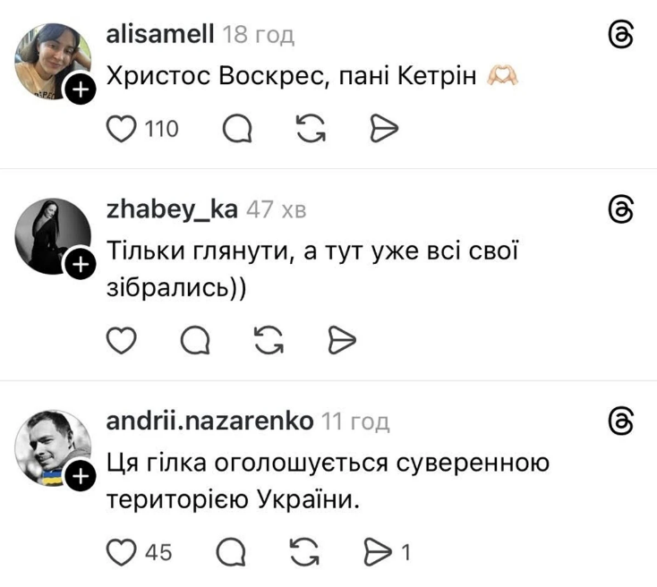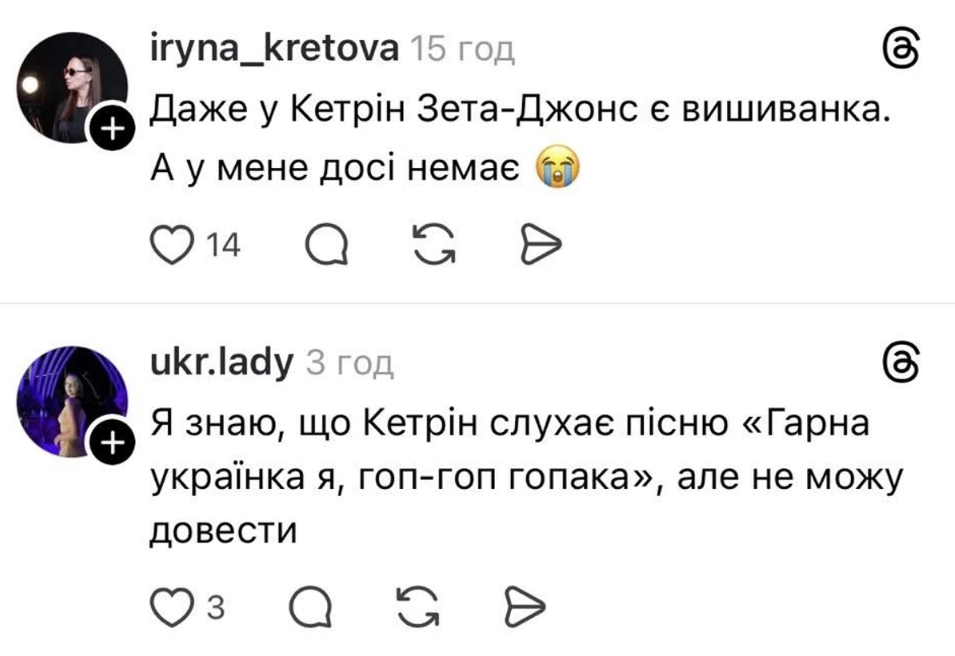 "Кэтрин Зета-Джонс в вышиванке, а ты еще нет!.. Ну наша... Христос воскрес, Кэтрин. Катя - молодец! Будь как Катя", - отреагировали подписчики.