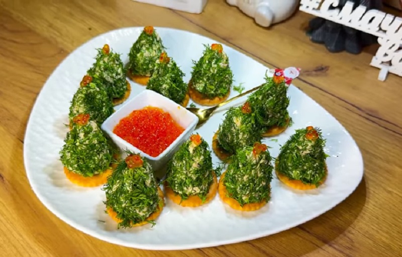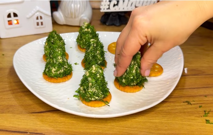 Выложить каждый шарик на крекер и вылепить корпус нужной формы. Украсить елочки укропом. Приятного аппетита.