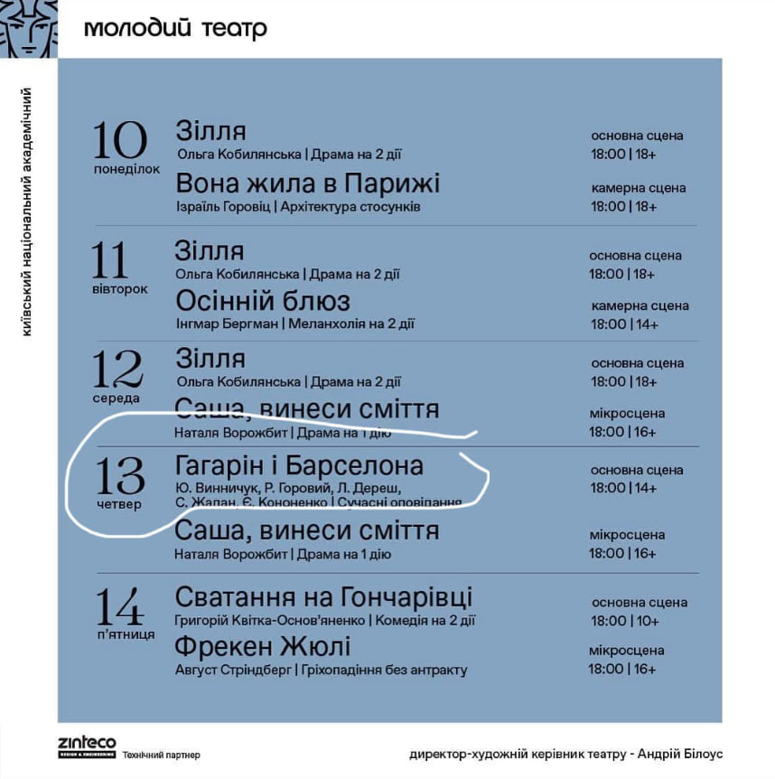 "Дал именно из-за понимания важности работы молодых актеров. И вот вижу, что спектакль, "Гагарин и Барселона", который должны были играть 13 февраля, заменили на другой. Можете проверить сами в расписании театра. (На фото первоначальное расписание и информация на сегодня). Как рассказали мне знакомые из театра, такая практика, избегание конфликта и замена спектаклей очень присуща руководителю", - отметил Горовой.