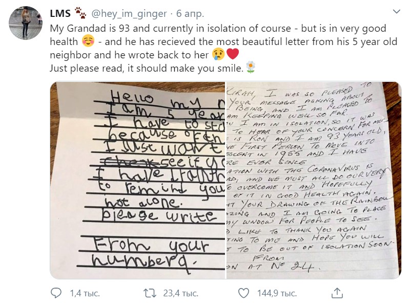 "Моему дедушке 93, он на самоизоляции, но со здоровьем у него все хорошо, - рассказала девушка. - Он получил самое прекрасное письмо в мире от своей 5-летней соседки. Пожалуйста, прочтите его, оно наверняка заставит вас улыбнуться".