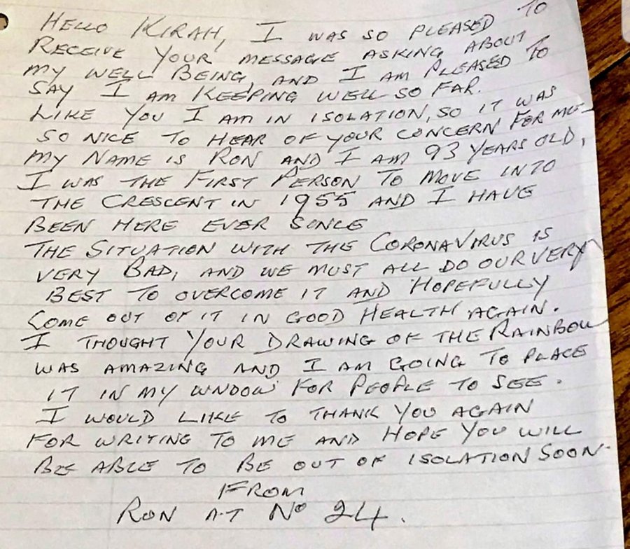"Привет, Кира! Я был очень рад получить твое письмо, в котором ты интересуешься моим состоянием. И я рад сообщить, что чувствую себя хорошо. Как и ты, я тоже сижу дома, но мне приятно слышать, что ты беспокоишься обо мне, - написал он. - Меня зовут Рон, и мне 93 года. Я был первым человеком, который приехал в (упоминается город, который трудно разобрать из-за почерка - theLime) в 1955 году. Ситуация с коронавирусом ужасна, и мы должны сделать все, что можем, чтобы ее преодолеть. Надеюсь, все будут здоровы. Твоя радуга просто потрясающая, поставлю ее на своем окне, чтобы ее увидели все. Хочу еще раз поблагодарить тебя за письмо. Надеюсь, твой режим изоляции скоро закончится. Рон из 24-ой квартиры".