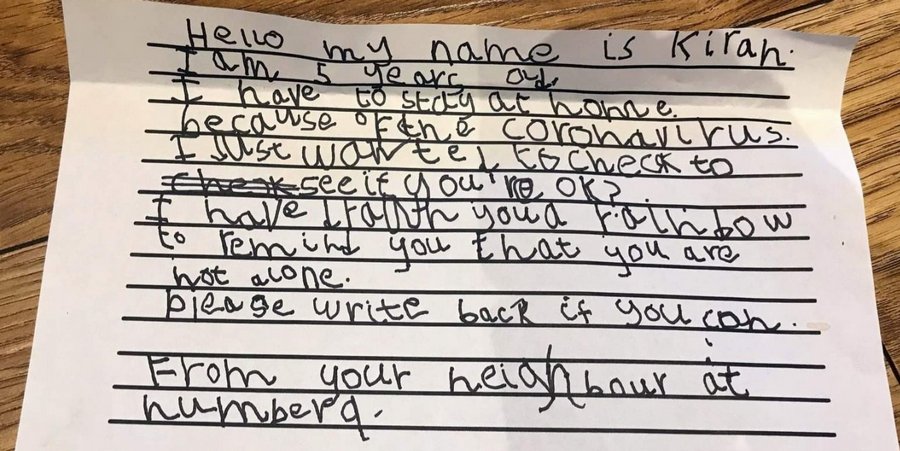 93-летний мужчина получил письмо от 5-летней соседки, которая перестала замечать пенсионера из окна своей квартиры. И его текст малого кого оставит равнодушным. Из-за карантина пенсионер и девочка вынуждены сидеть в четырех стенах, но с такой поддержкой старику уже не будет одиноко.
