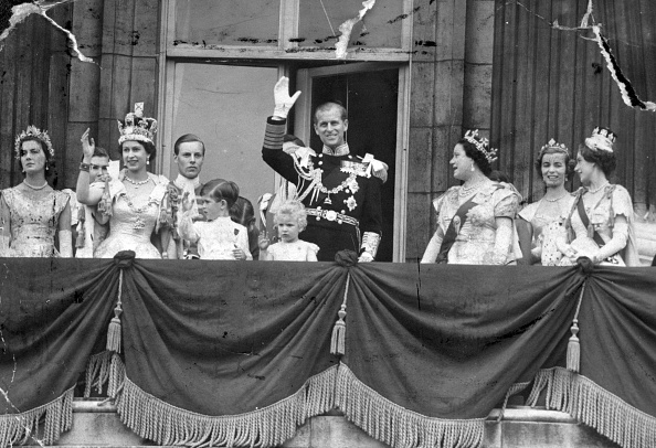 Елизавета II машет рукой с балкона Букингемского дворца после коронации в Вестминстерском аббатстве. Рядом с ней - Филипп, герцог Эдинбургский, маленькие принц Чарльз и принцесса Анна. Рдямо с Филиппом стоит королева-мать, Елизавета Боуз-Лайон