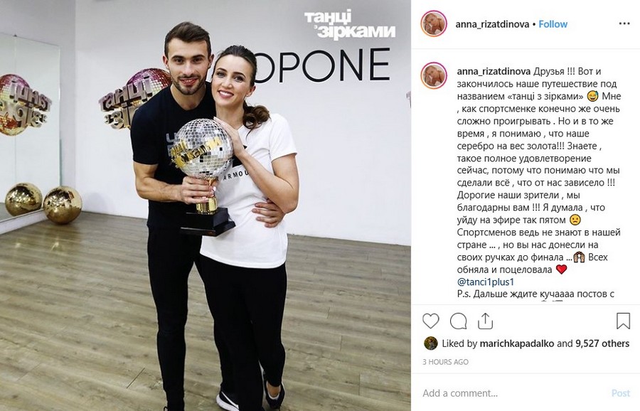 "Вот и закончилось наше путешествие под названием "Танці з зірками". Мне, как спортсменке, конечно же, очень сложно проигрывать. Но и в то же время я понимаю, что наше серебро на вес золота!" - отметила Ризатдинова.