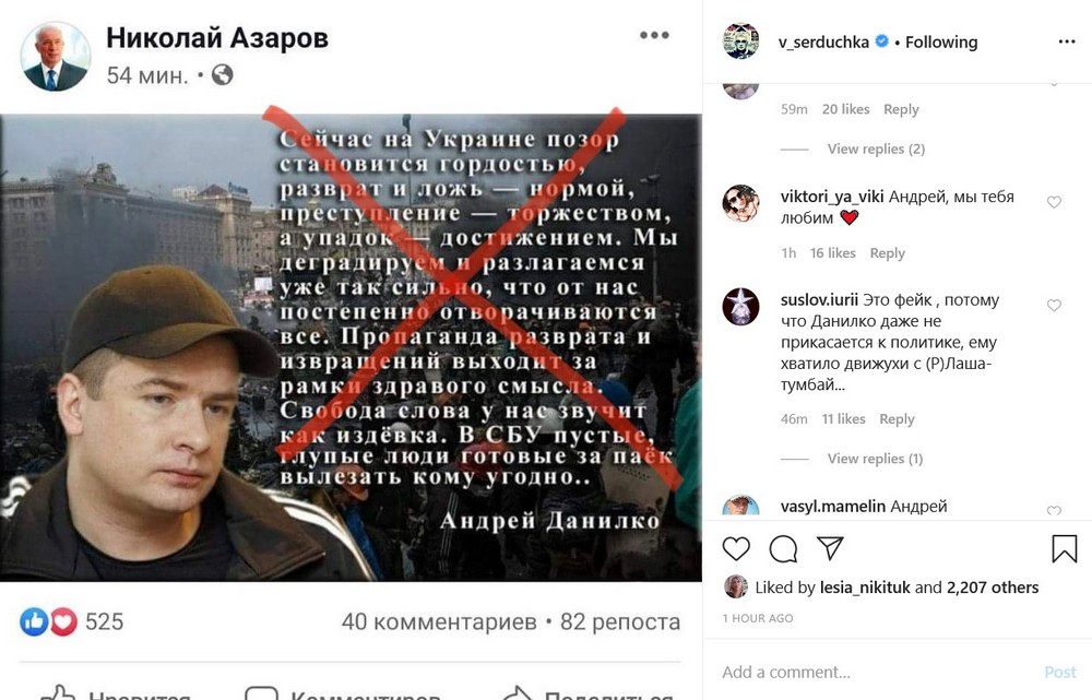 "Внимание! Фейк!" - написали на странице Верки Сердючки, приложив к посту скрин со страницы Николая Азарова. Вскоре после этого пост с цитатой исчез. Признавать свою ошибку и оправдывать артиста Азаров, конечно же, не стал.