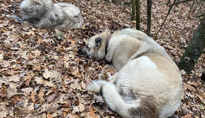 Сказочник Сашко Лирник (Александр Власюк) встретил у леса в Корсуне Черкасской области двух огромных алабаев.