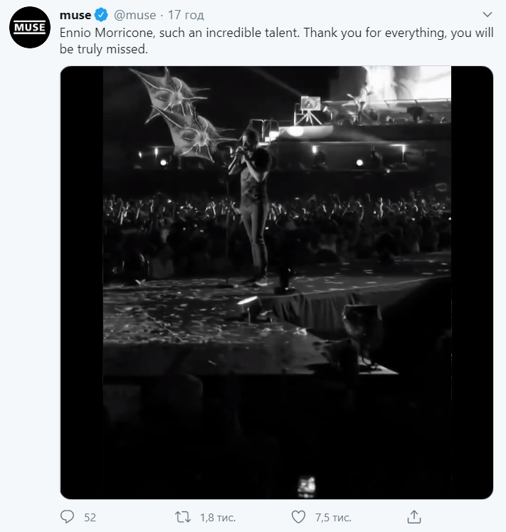 "Эннио Морриконе, такой невероятный талант. Спасибо за все, вас будет очень нехватать" (Muse)