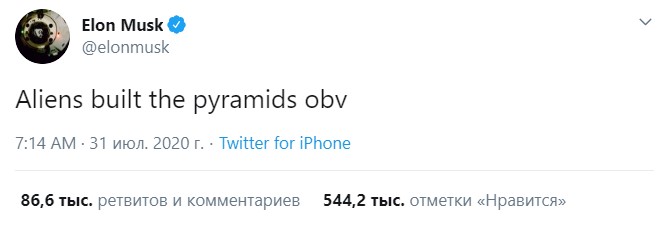 Размышляя о пирамиде Хеопса, которая годами оставалась самой высокой постройкой человечества, Маск также поделился мнением, что фараон Рамзес II был одним из неземных существ, что вызвало дискуссии и шутки. Но больше всего внимания получил первый твит предпринимателя, который собрал более 500 тысяч лайков и десятки тысяч ретвитов.