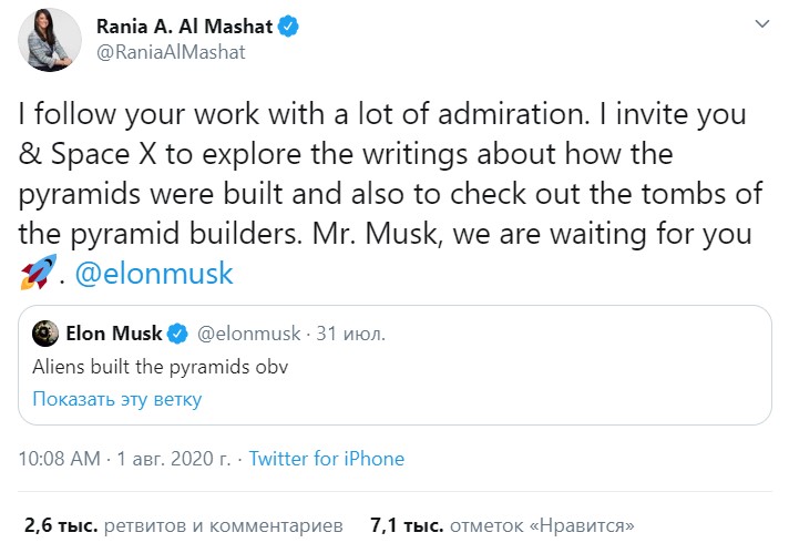 "Я слежу за вашей деятельностью с большим восхищением, - написала в соцсети Рания аль-Машат. - Приглашаю вас и SpaceX, чтобы вы могли изучить письменные свидетельства о том, как были построены пирамиды, а также посмотреть на гробницы их строителей".