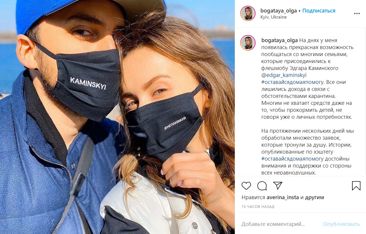 На снимке влюбленные позируют в черных медицинских масках. В посте Богатая рассказала о благотворительном флешмобе, к которому присоединился ее "любимый человек".