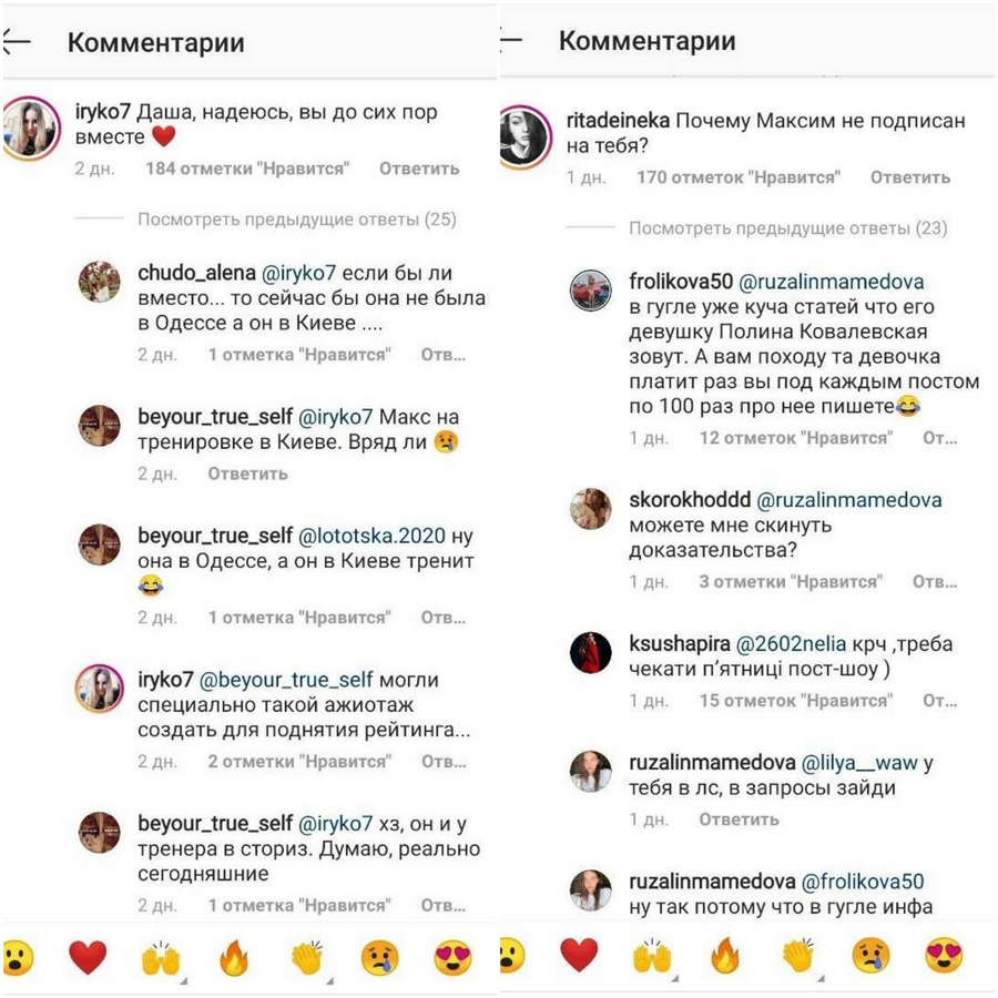 Сами герои передачи этот вопрос не комментируют, впрочем, как не отвечает на расспросы и Полина Ковалевская, которой приписывают роль настоящей девушки Максима Михайлюка.