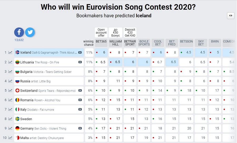 До старта Евровидения-2020 в Роттердаме остается чуть более двух месяцев, и на этом этапе прогнозы букмекеров притягивают к себе все больше внимания зрителей песенного конкурса. Оно и неудивительно, ведь из года в год букмекеры если не угадывают победителя, то оказываются очень очень близки к реальным итогам.