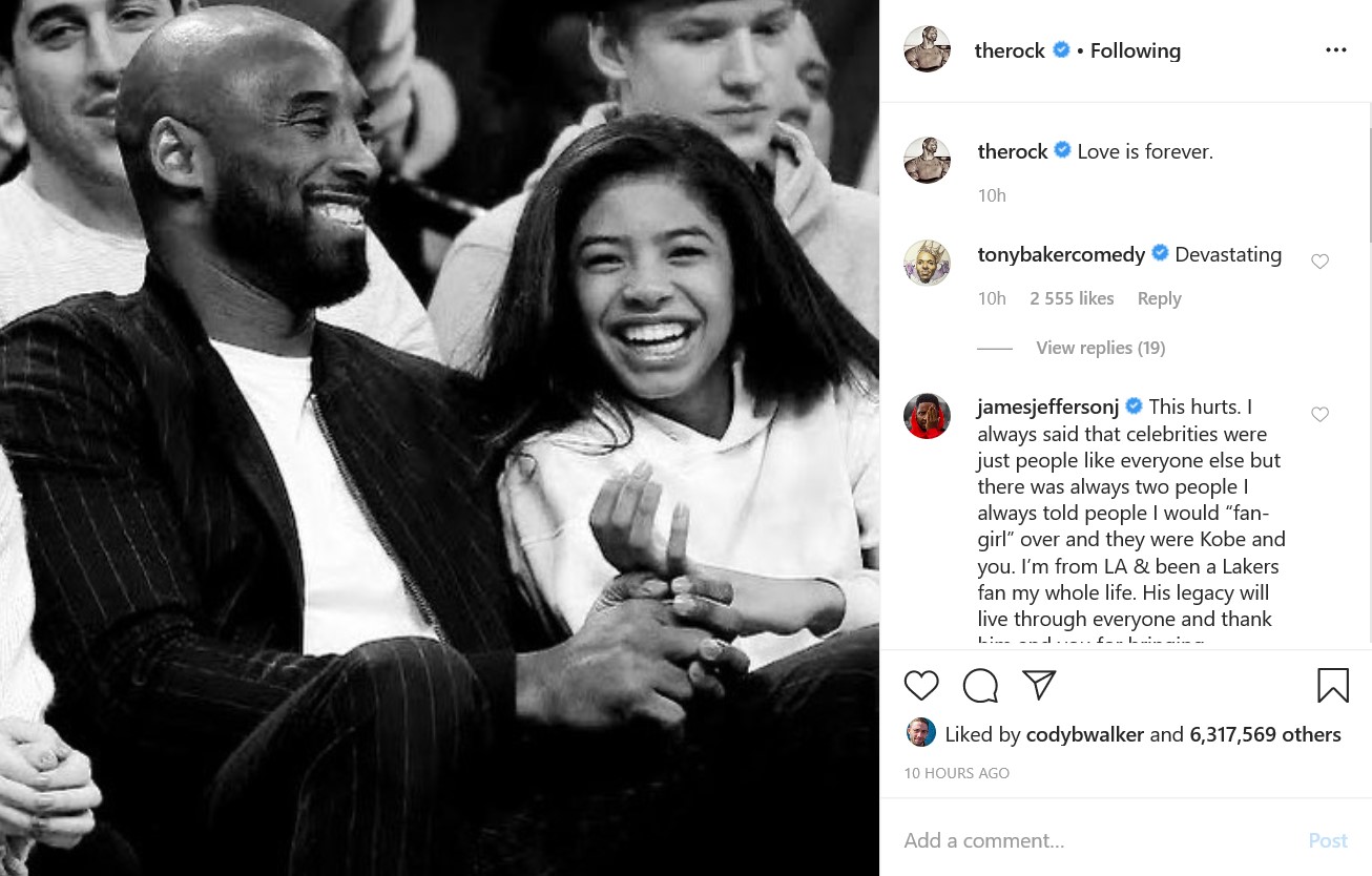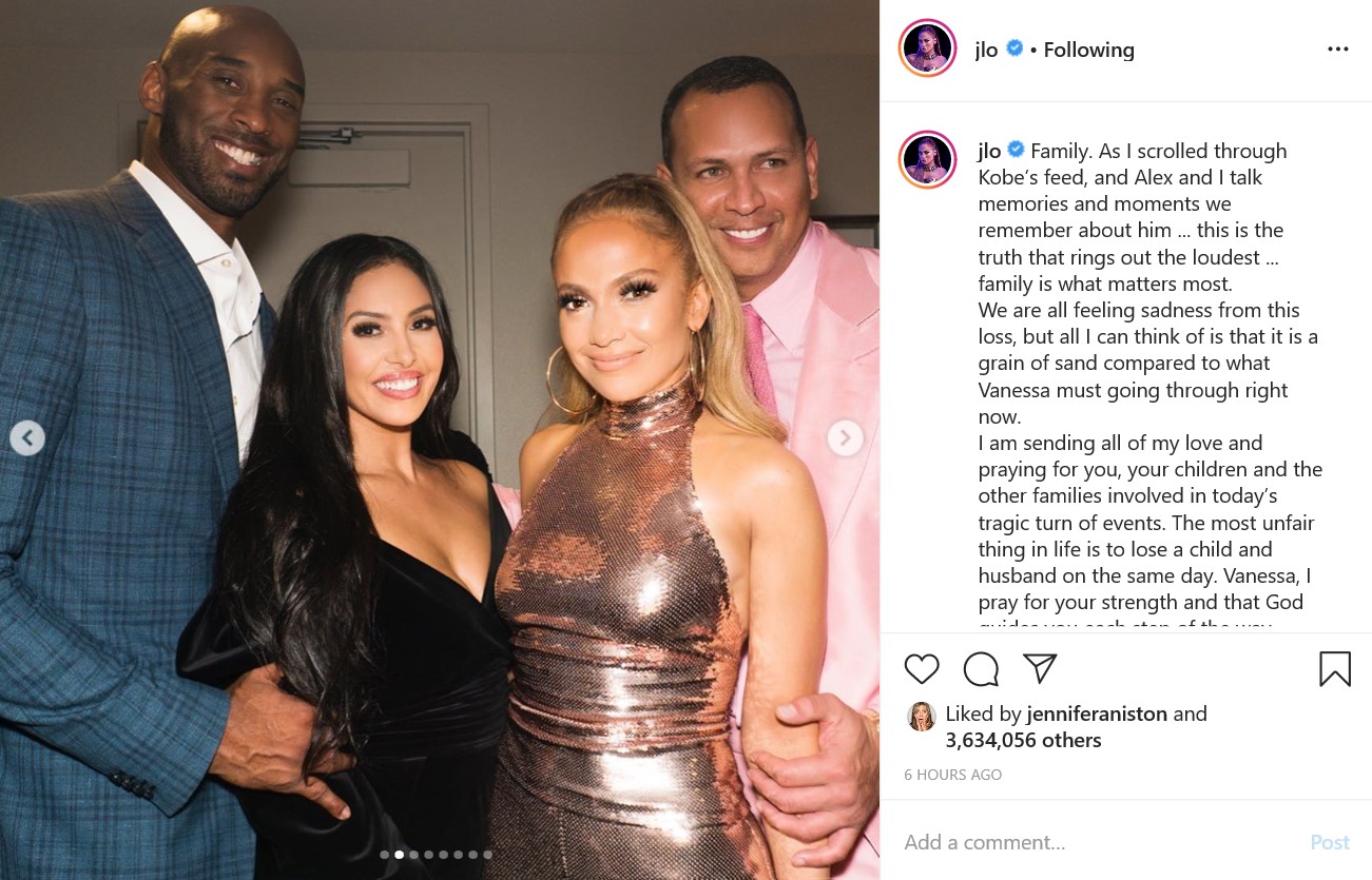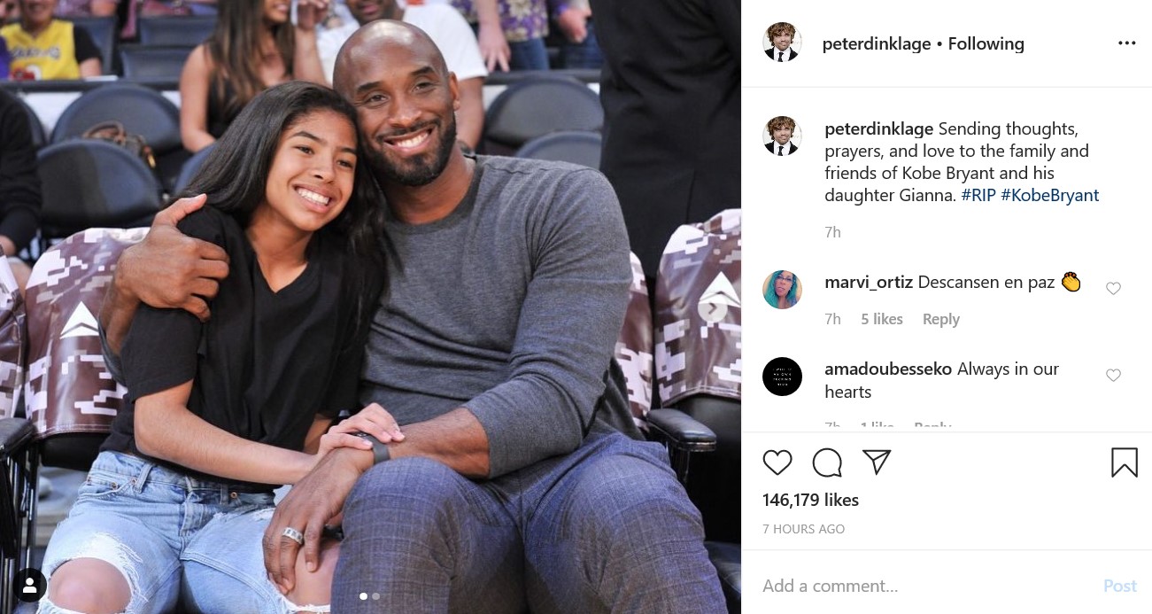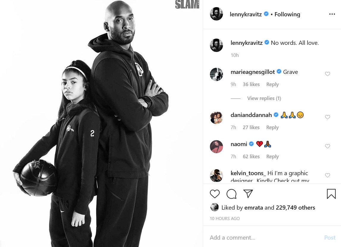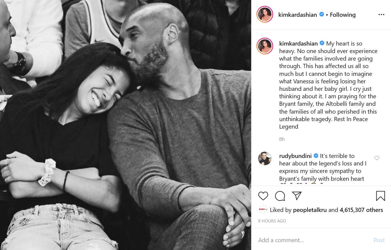 "Мое сердце разрывается. Никто никогда не должен испытывать то, через что проходят семьи и близкие. Это шокировало всех нас, но я не могу представить, что Ванесса чувствует, потеряв мужа и дочь. Я плачу, просто думая об этом. Я молюсь за семью Брайанта, семью Альтобелли и семьи всех, кто погиб в этой немыслимой трагедии. Покойся с миром, Легенда", - написала Ким Кардашьян, приложив к своему посту совместное фото Коби Брайанта с дочерью, которая, к несчастью, тоже находилась с отцом в салоне вертолета.