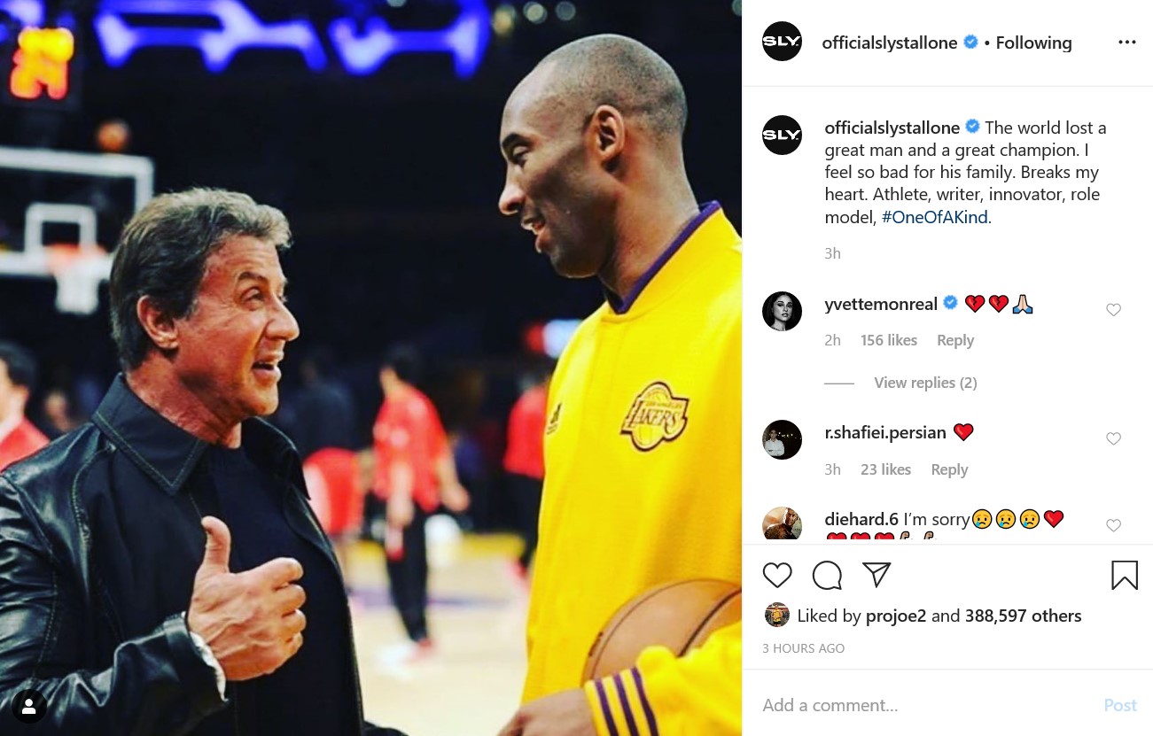 "Мир потерял великого человека и великого чемпиона. Мне так жаль его семью. Это разбивает мне сердце. Спортсмен, писатель, новатор, образец для подражания", - написал под своим фото Сильвестр Сталлоне.