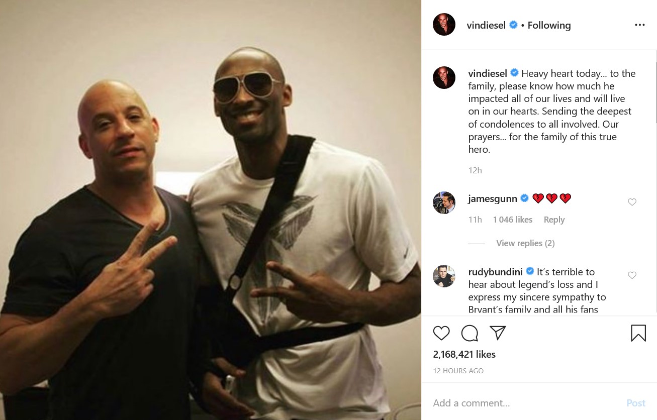 "Тяжело на сердце сегодня... для семьи: пожалуйста, знайте, он сильно повлиял на наши жизни и будет жить в наших сердцах. Глубочайшие соболезнования всем. Наши молитвы сегодня за семью этого истинного героя", - написал в личном микроблоге Вин Дизель.