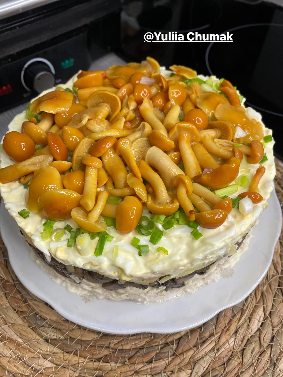 Верхний слой посыпать измельченными яйцами, майонезом нарисовать узор в виде сетки или другой, по вашему вкусу. И вишенка на торте – консервированные опята небольшого размера.