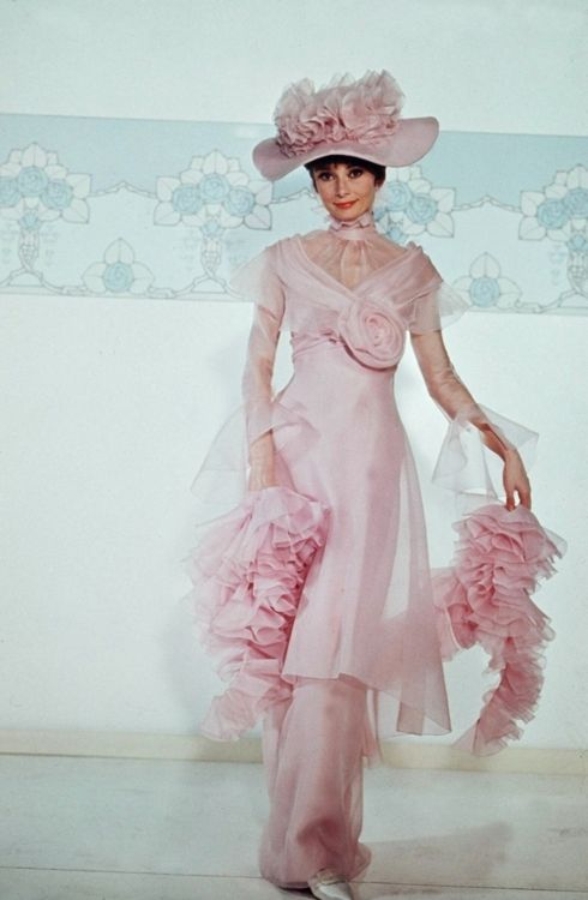 Над костюмами для музыкального фильма по пьесе Бернарда Шоу "Пигмалион" трудился легендарный художник по костюмам и декорациям Сесил Битон, включенный в 1970 году в международный Зал славы самых стильных людей. Битон проделал огромную работу, изобразив превращение неряшливой цветочницы Элизы Дулиттл (Одри Хепберн) в помпезную светскую львицу. Ее декорированные цветами и лентами платья и причудливые широкополые шляпы до сих пор поражают своей экстравагантностью, и знаменитая стилизованная фотосессия Леди Гаги для январского выпуска Vanity Fair в 2012 году - прямое тому подтверждение.