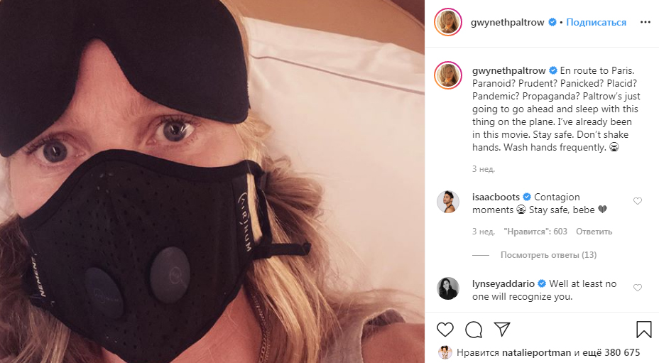 Исполнительница главной роли Гвинет Пэлтроу тоже настроена серьезно. Правда, она не смогла удержаться от небольшой шутки о фильме. В недавней публикации на своей страничке в Instagram актриса написала: "Пэлтроу просто собирается пойти спать в самолете с этой штукой на голове. Я уже была в этом фильме. Берегите себя. Откажитесь от рукопожатий. И мойте руки почаще".