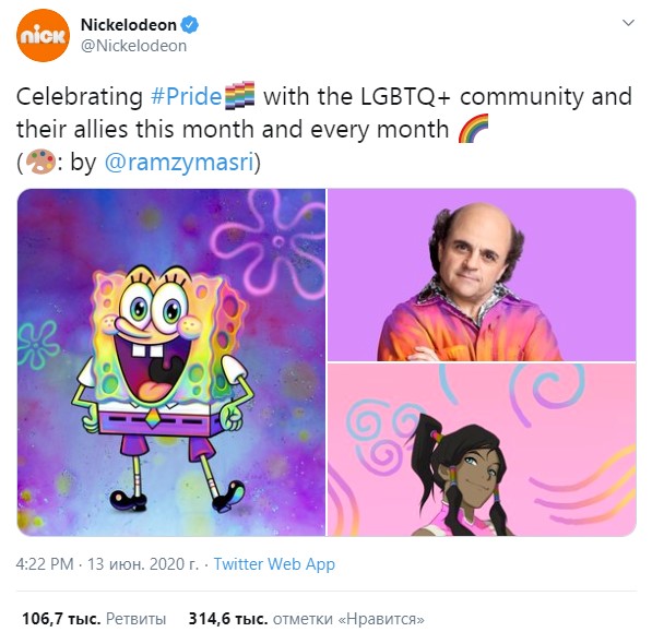 "Чествуем #Pride с сообществом ЛГБТК+ и их союзниками в этом месяце и каждый месяц", - говорится в публикации Nickelodeon в Twitter. Канал поделился с подписчиками радужной иллюстрацией любимого персонажа, а также изображением бисексуалки Корры из мультфильма "Легенда о Корре" и фотографией транссексуального актера Майкла Д. Коэна из сериала "Опасный Генри".