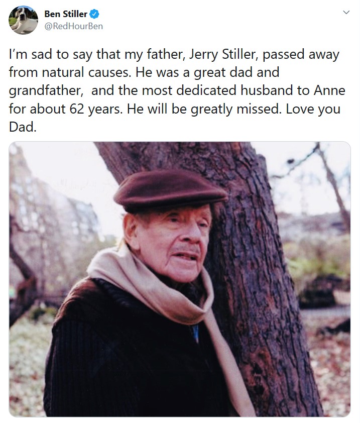 "Мой отец, Джерри Стиллер, ушел из жизни по естественным причинам, - написал актер. - Он был замечательным отцом и дедушкой, а также самым преданным мужем своей жены Энн в течение 62 лет. Мы будем по нему сильно скучать. Люблю тебя, папа".
