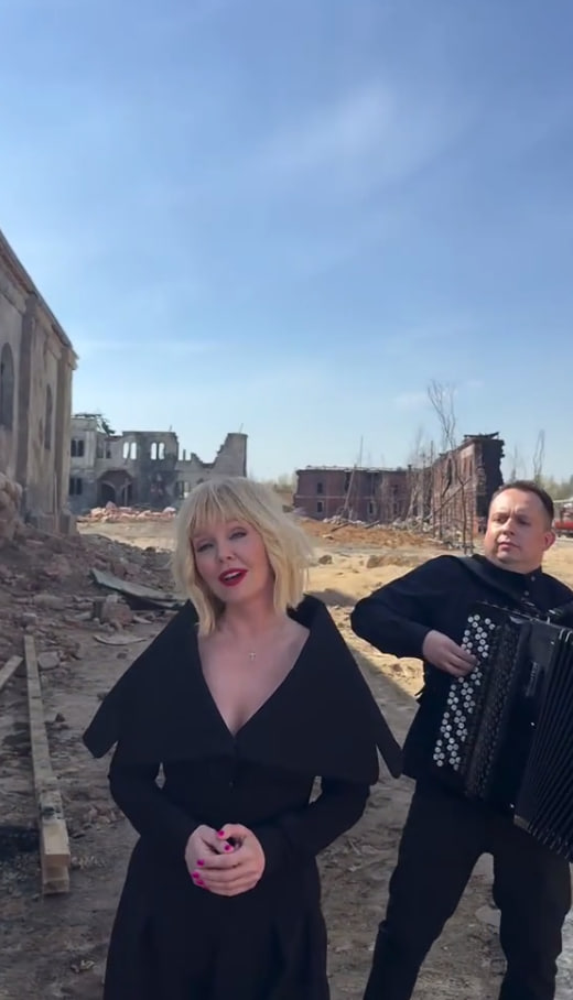 Так, на фоне разбитых построек Валерия ярко показывает "русский мир", который находится позади нее. Певица исполняет песню "С чего начинается Родина".