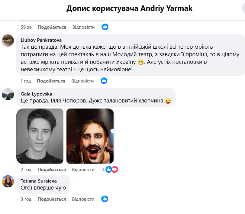 О популярности актера и о том, что иностранцы, например, британские школьники, мечтают попасть на спектакль в Украину, свидетельствуют также комментарии под сообщением.