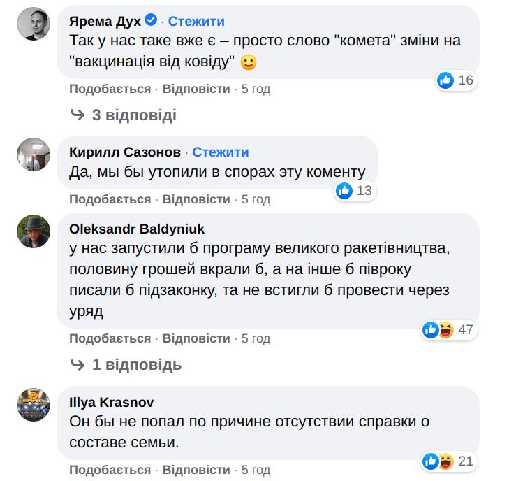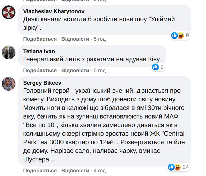 "Да у нас такое уже есть – просто слово "комета" замени на "вакцинацию от ковида"", - пишут люди. - "У нас бы еще справки об отсутствии кометы продавали". "Украинского в фильме и так достаточно много, как для Голливуда – офис президента вместе с Ермаком списаны прямо с натуры. Да это и не удивительно, если автор сценария - однозначно наш человек, потому что его фамилия - Сирота".