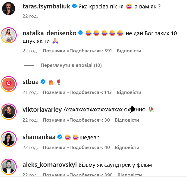 "Какая красивая песня, - смеясь написал звезда сериала "Спіймати Кайдаша" на своей странице в Instagram. - А вам как?". В комментарии пришли поклонники и звездные друзья Цымбалюка, в частности актриса Наталка Денисенко, блогер Алина Шаманская, его бывшая и экс-участница "Холостяка" Виктория Варлей, кинорежиссер Алексей Комаровский, актер Александр Черкашин и многие другие.