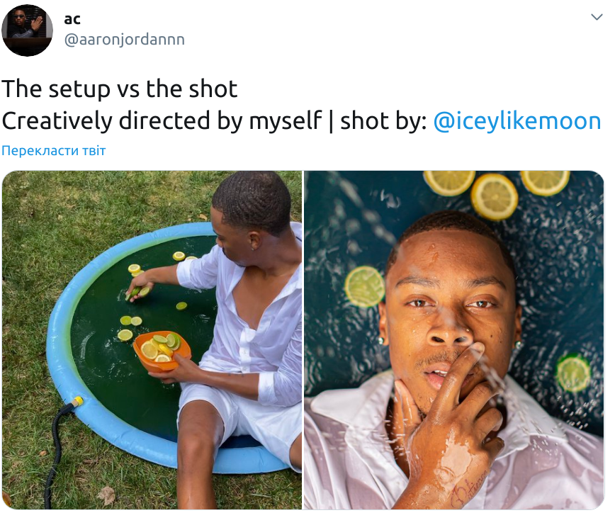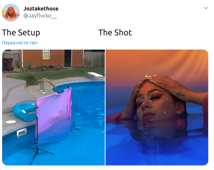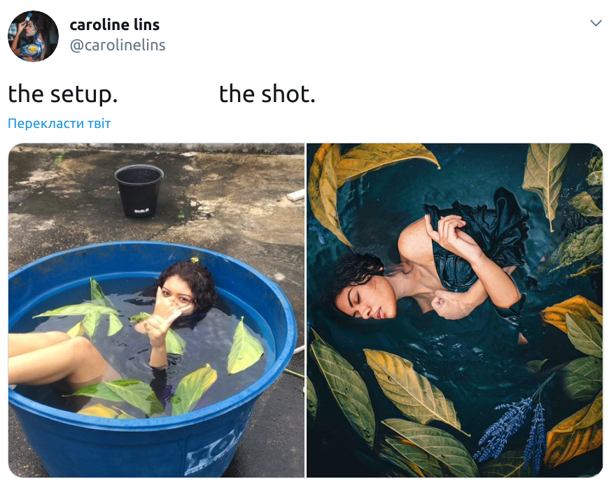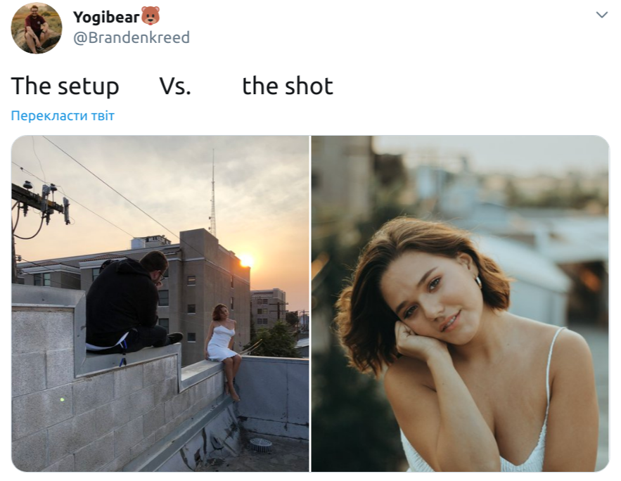 Работы профессиональных фотографов многим кажутся непостижимой формой искусства, но даже самые эстетичные из них могут скрывать за собой неприглядную реальность. В Twitter набирает популярность флешмоб "setup vs. the shot", где фотографы делятся правдой про подготовку к съемке и сравнивают ее с готовыми фотографиями. Теперь мы знаем, какой изворотливости и креатива требуют красивые кадры, и как на самом деле важен правильный ракурс.