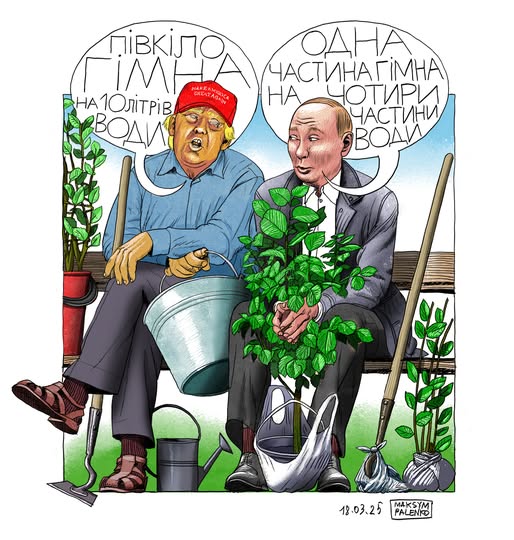 Украинский художник и иллюстратор Максим Паленко отразил в карикатуре, как, по его мнению, мог бы выглядеть разговор американского президента Дональда Трампа и российского диктатора Владимира Путина "накануне дачного сезона".