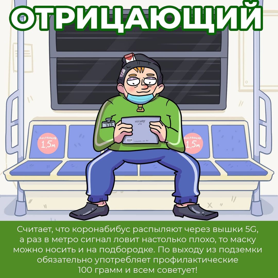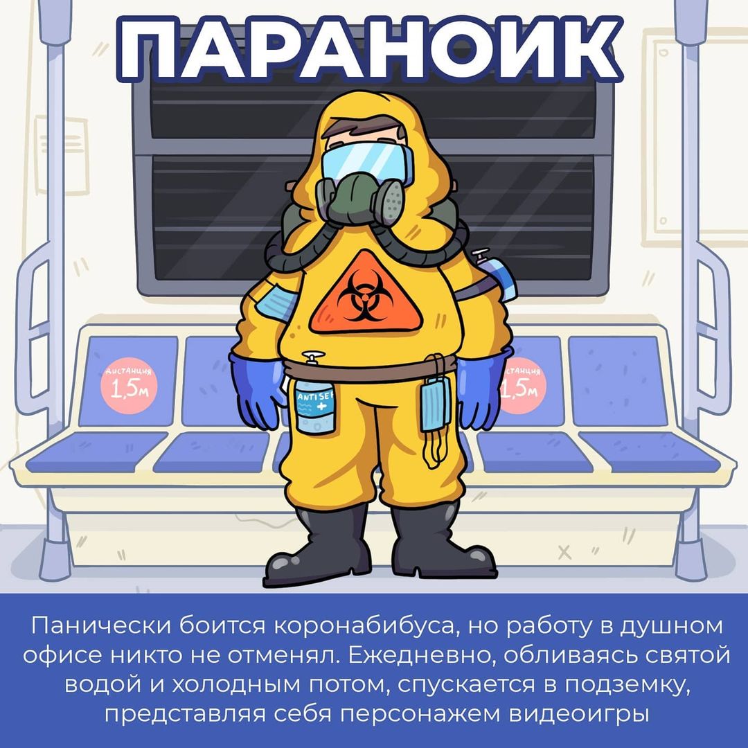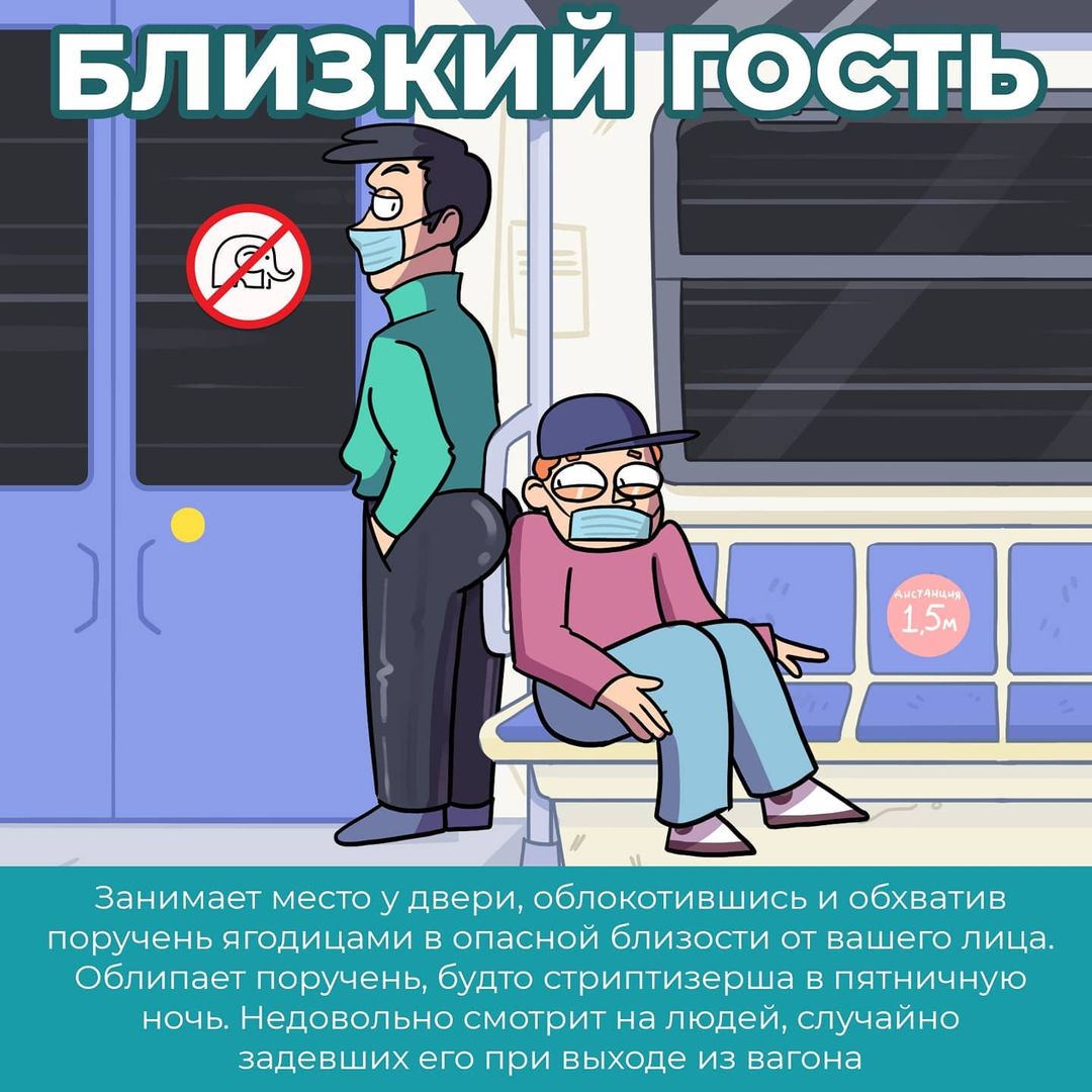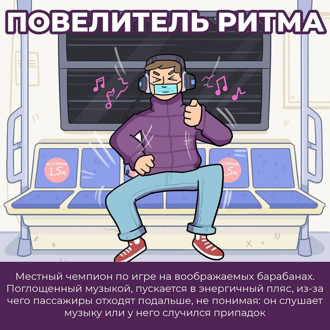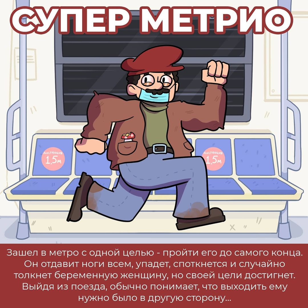 Все свои работы с ироничными комментариями мастер цифрового искусства публикует в Instagram. Взгляните и вы на серию картинок, посвященных обитателям метро в нынешних реалиях. Наверняка, с некоторыми из них, вы хоть раз да и ездили в одном вагоне. Художник поделил людей на такие типы: "параноик", "отрицающий", "супер метрио", "повелитель ритма" и "близкий гость".