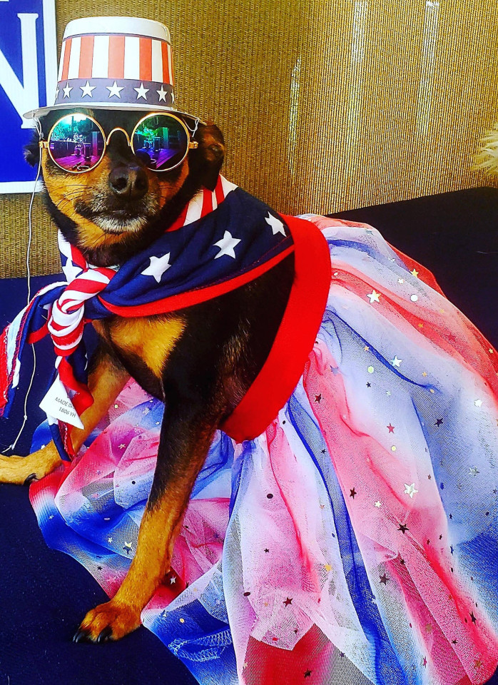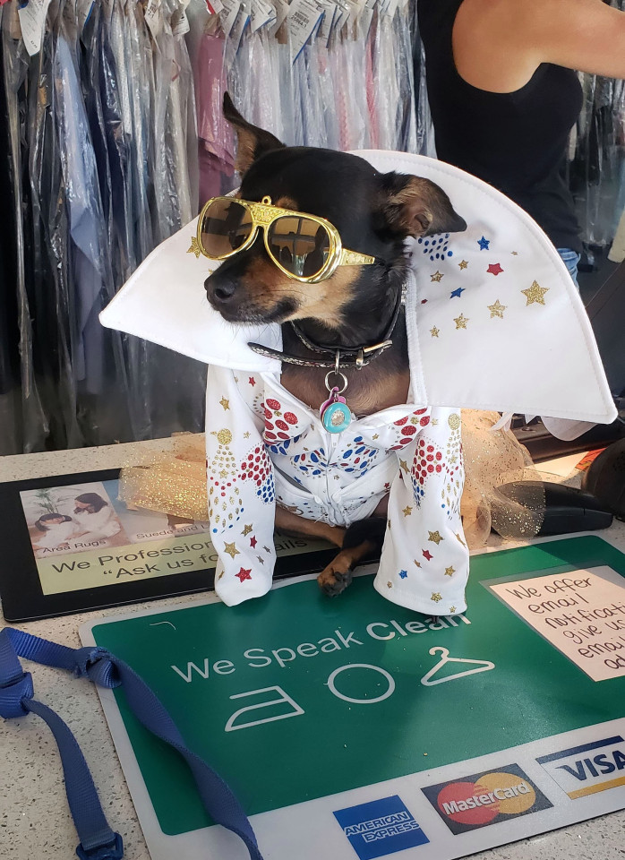 Чихуахуа получила свое имя в честь Элвиса Пресли - любимого артиста матери Ребекки. Женщина решила, что стиль собаки будет соответствующим - со стразами, блестками и яркой бижутерией. Теперь у Пресли есть "личный дизайнер", который создал для нее достаточно нарядов, чтобы никогда не повторяться: в гардеробе собаки - 150 платьев, а также множество футболок и юбок.