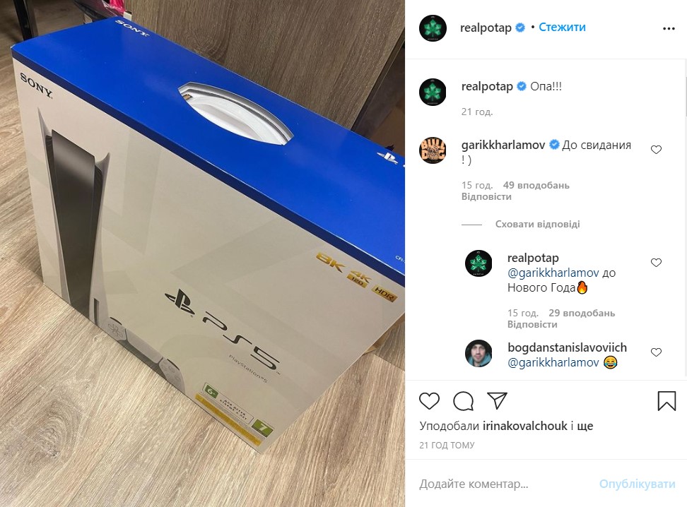 "Опа!!!" - написал он под снимком еще запакованной консоли. Первым в новую реальность Потапа проводил шоумен Гарик Харламов: "До свидания!" - ответил он. Потап не стал отрицать, что здорово залипнет за новыми играми, и ответил Харламову - "До нового года!"