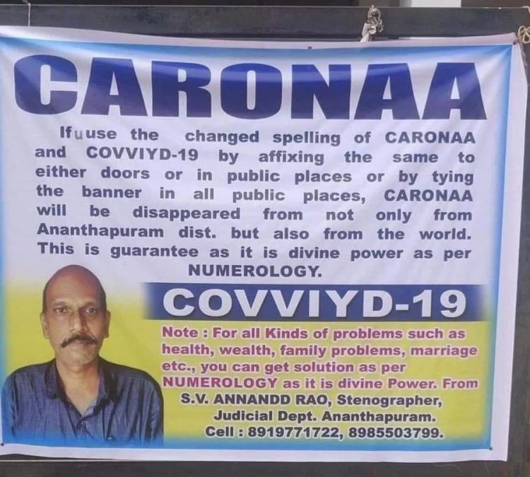 "Если вы используете измененное написание Caronaa и Covviyd-19, прикрепив такой же баннер к двери или где-нибудь в общественных местах, Caronaa исчезнет не только из района Анантапурам, но также и из мира", - написано на плакате.