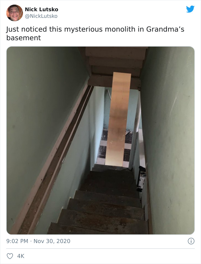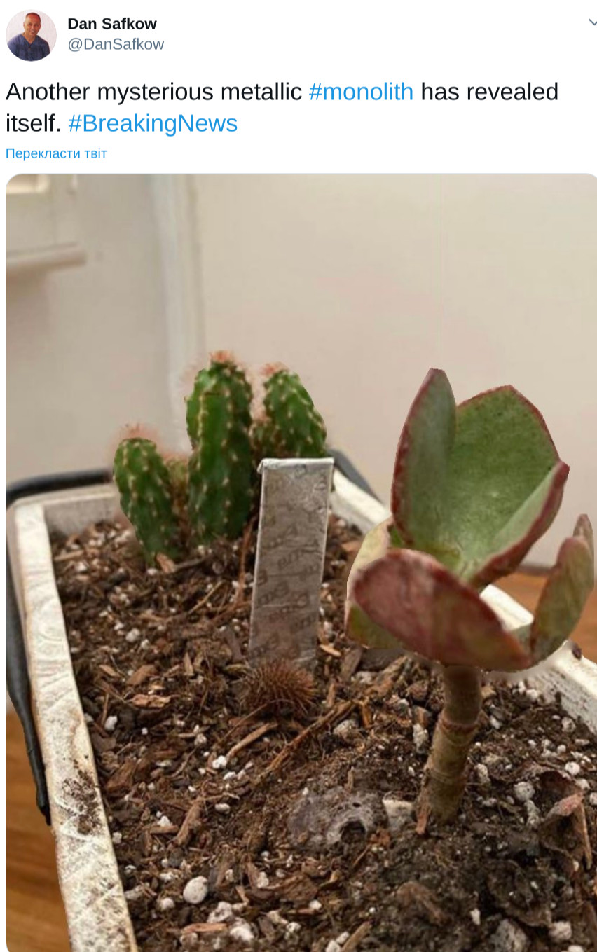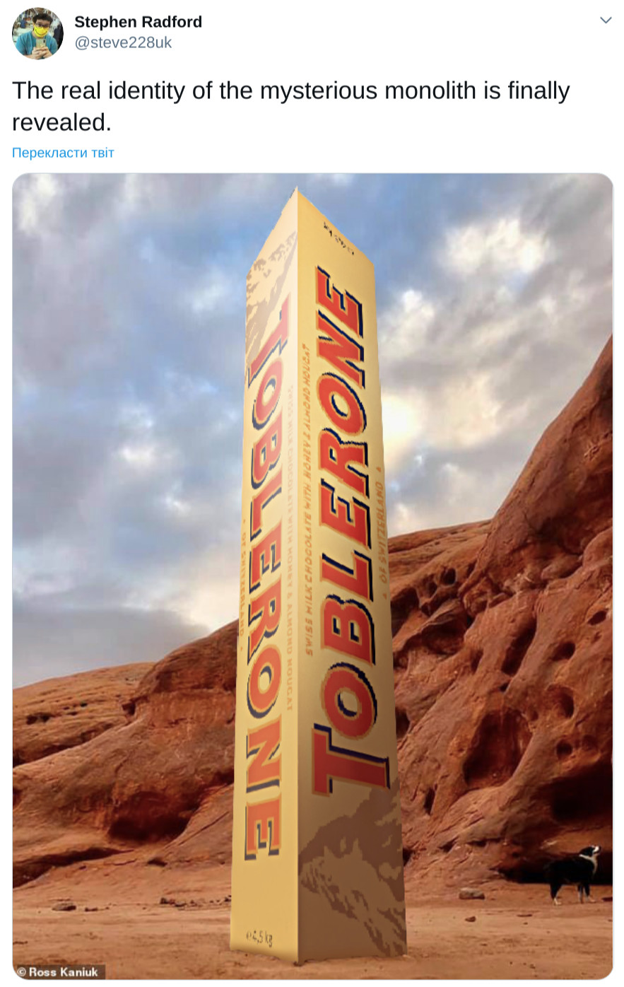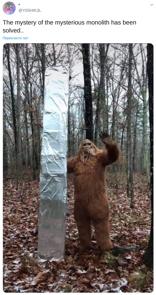23 ноября в пустыне Юты нашли загадочный металлический монолит, через неделю его брат-близнец появился в Румынии, а теперь еще один похожий объект обнаружили в Калифорнии. Пока одни пользователи сети размышляют, не предвещают ли эти конструкции скорой встречи с инопланетными гостями, другие упражняются в остроумии. В Twitter, Instagram и Facebook появляются десятки мемов о монолите, и theLime собрал самые смешные из них.