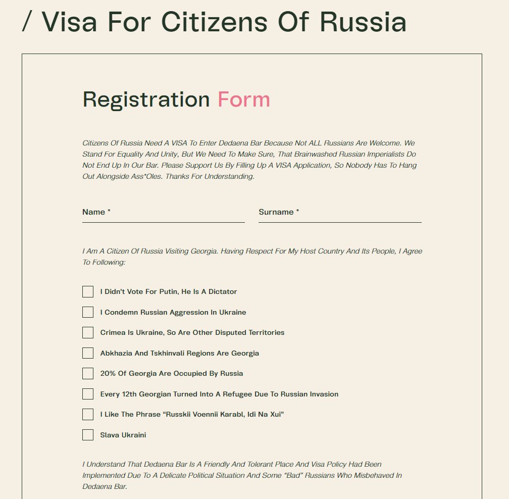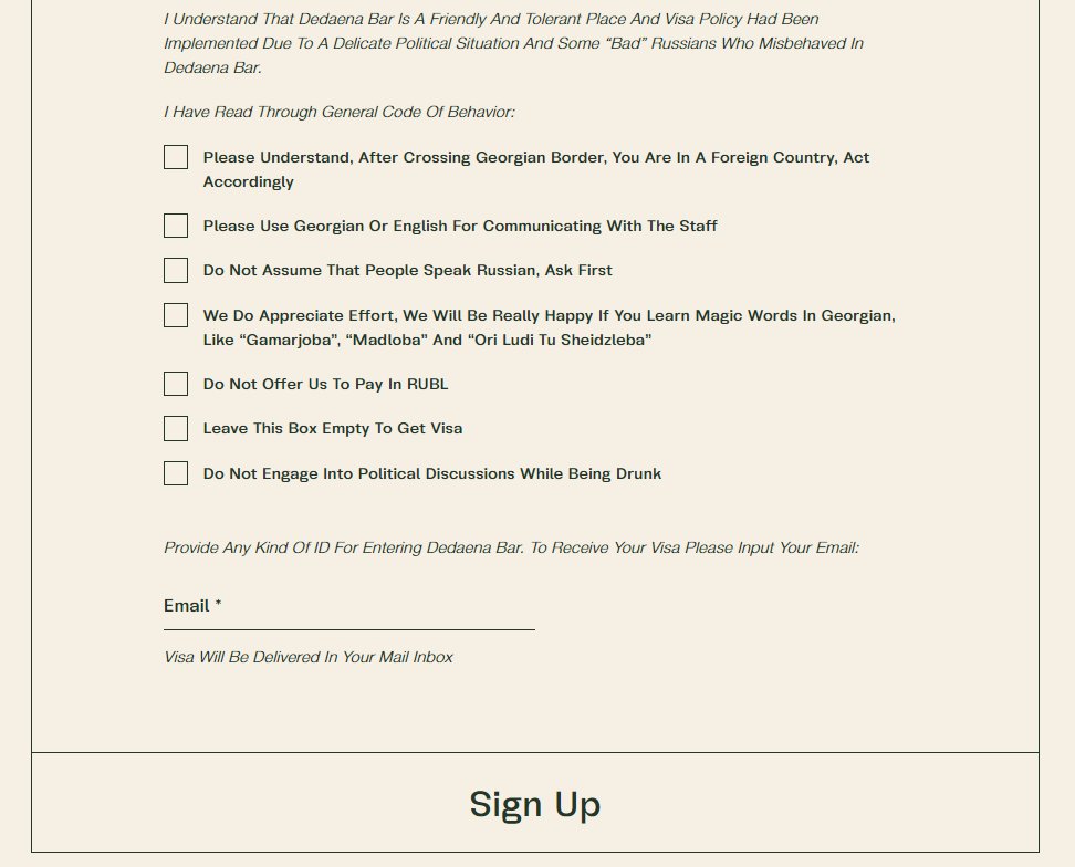 Грузинский бар Dadaena в Тбилиси креативно подошел к фейсконтролю посетителей. Заведение ввело "визы" для россиян, которые захотят его посетить.