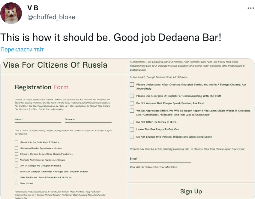 "Вот так и должно быть. Хорошая работа, Dedaena Bar!" "Грузия, вы лучшие". "А потом эти анкеты - в ФСБ в рашку". "Вот у кого-то подгорит хорошенько", - пишут в комментариях.