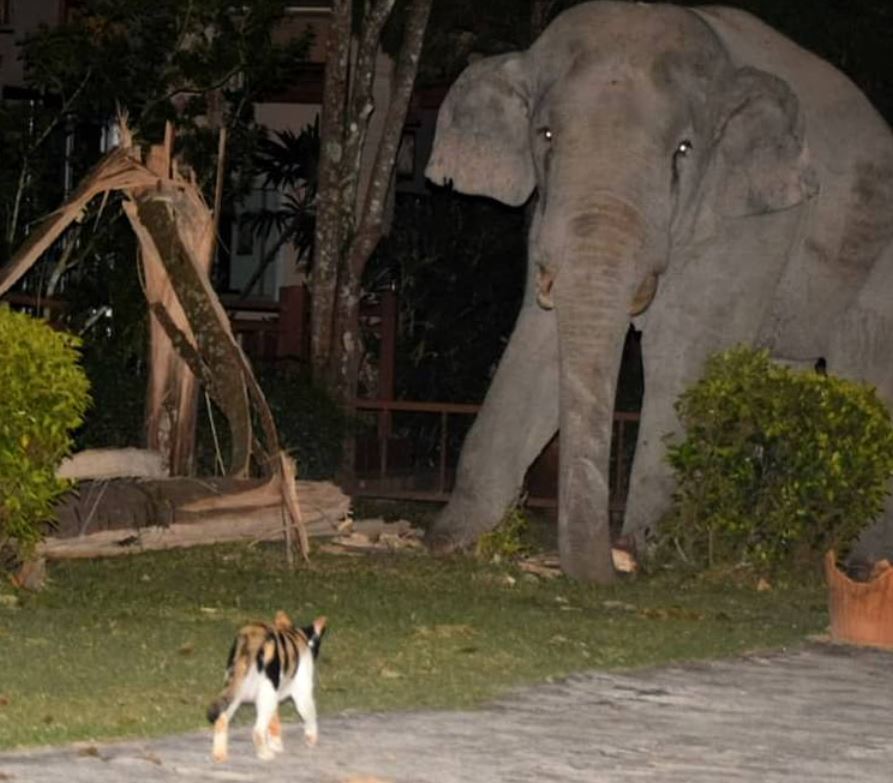 Слон забрел ночью к людям во двор, чтобы найти там что-нибудь вкусненькое, но у него на пути встал кот. Несмотря на огромную разницу в размерах, пушистый охранник ни капельки не струсил, а наоборот смело вышел к незваному гостю и прогнал его.