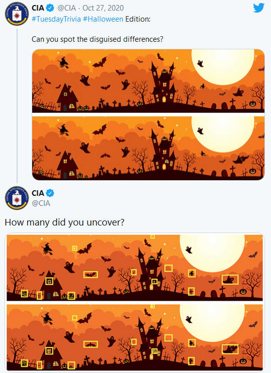 На официальной странице центрального разведывательного управления в Twitter опубликован твит, состоящий из двух хэллоуинских картинок. На них изображены кладбища, тыквы, летучие мыши, привидения и ведьмы на метлах. "Вы сможете заметить скрытые различия?", - написало агентство. Давайте посмотрим, справитесь ли с этим заданием вы? А ответы мы предоставим ниже.