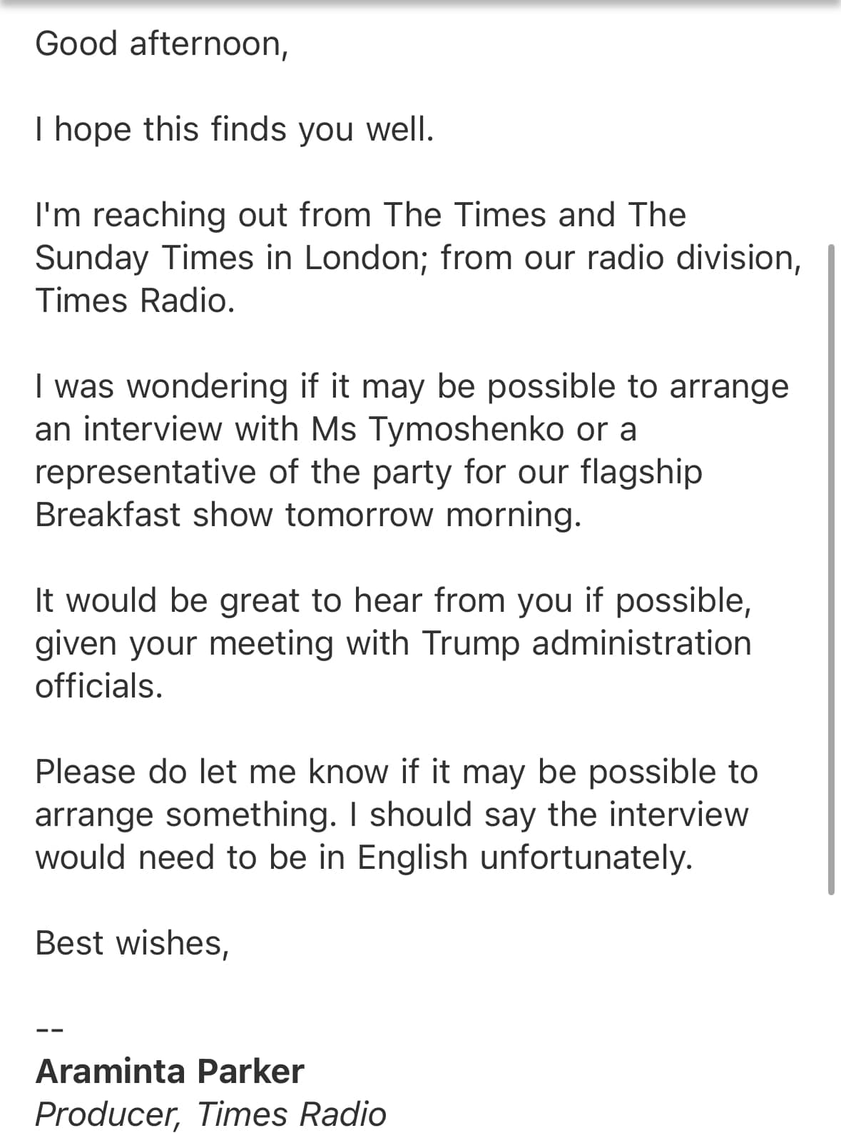 "Возможно ли будет договориться об интервью с госпожой Тимошенко, или представителем партии для нашего главного шоу "Завтрак" завтра утром. Было бы здорово услышать вас, если это возможно, учитывая вашу встречу с представителями администрации Трампа. Пожалуйста, дайте мне знать, можно ли что-то организовать", - говорится в письме.