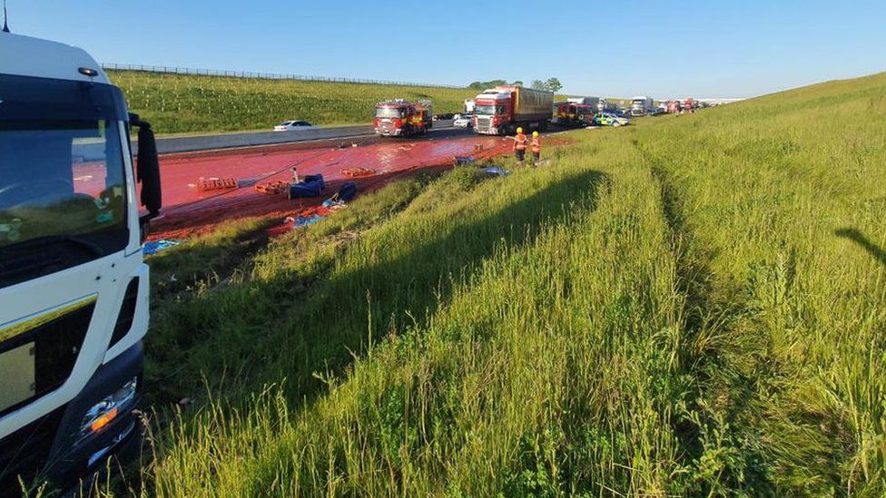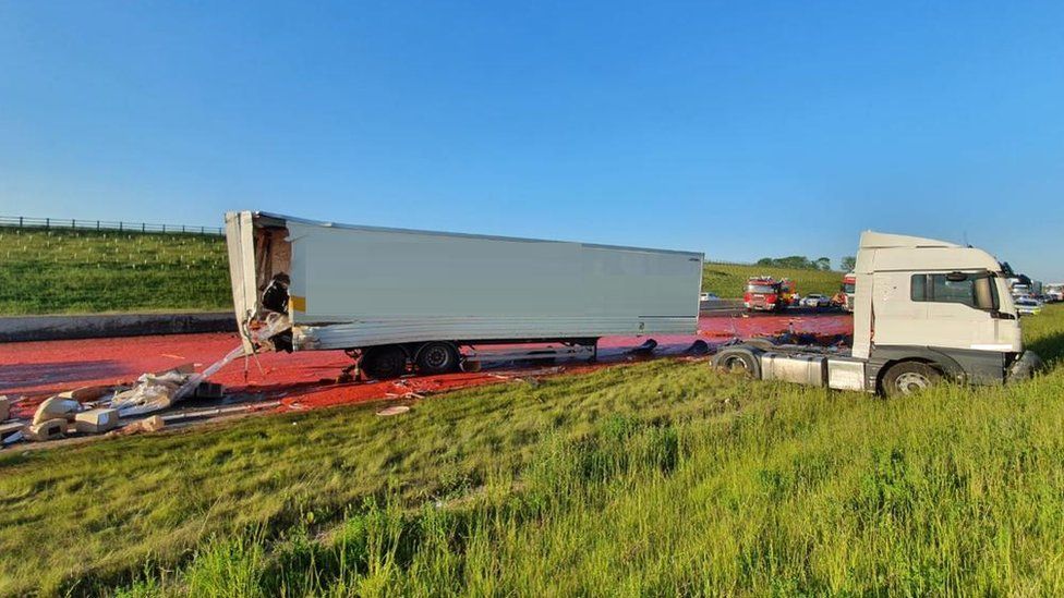 Томатное пюре растеклось по дороге огромной красной лужей, и копы первым делом заподозрили непоправимое. К счастью, обошлось без жертв. "То, что выглядело как декорация из фильма ужасов, на самом деле оказалось тысячами раздавленных помидоров", - написала полиция в Twitter.