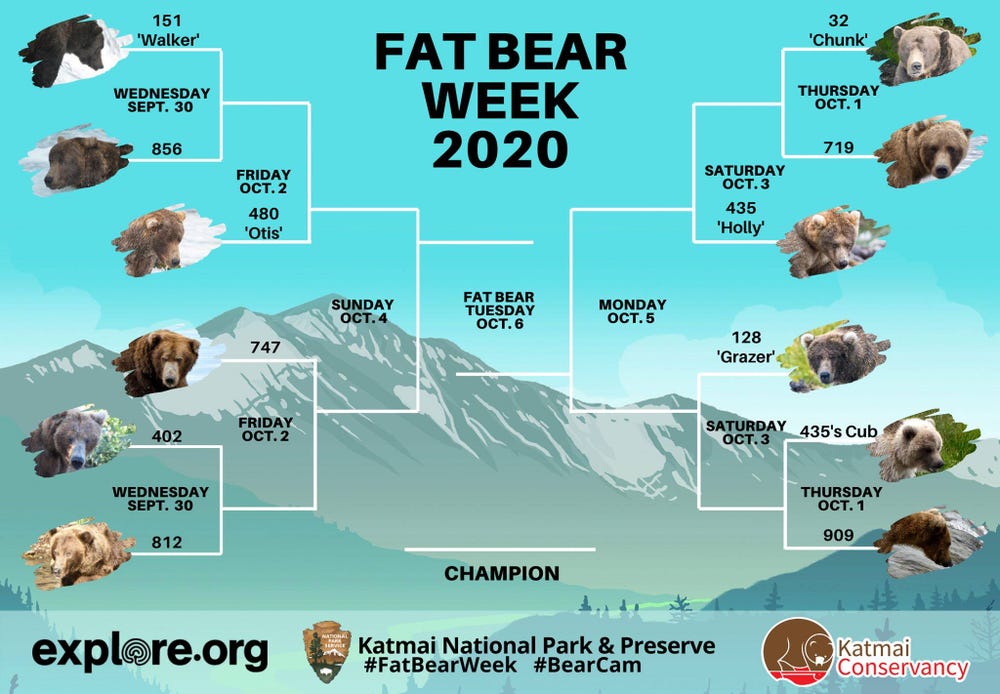 Каждый год национальный парк Катмай на Аляске устраивает соревнование, которое в мире людей кажется немыслимым. Путем голосования посетители сайта парка выбирают самого толстого медведя. Конкурс длится неделю, и с 30 сентября по 6 октября болельщики каждый день решают, какой из двух косолапых участников стал более упитанным.