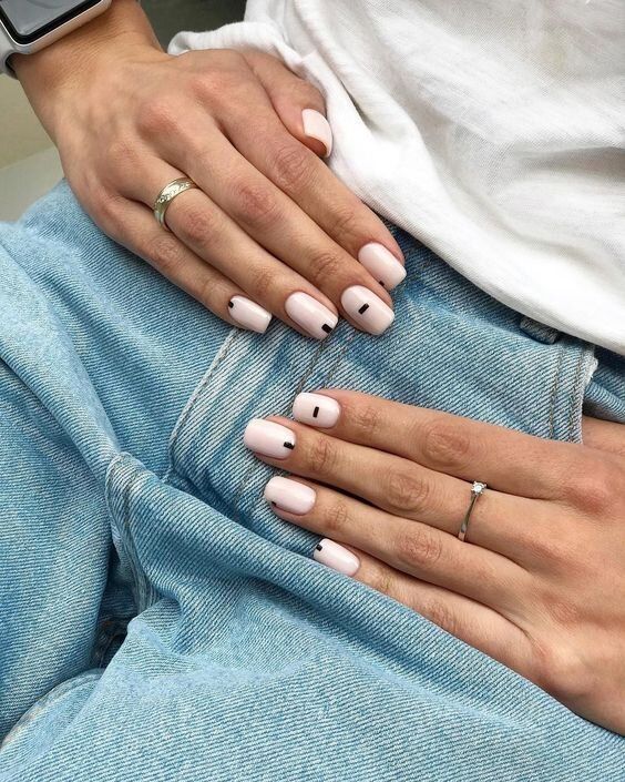 Как вариант – разнообразить такой маникюр черными акцентами. Это могут быть точки одного размера, линии и даже хаотично разбросанные мазки.
