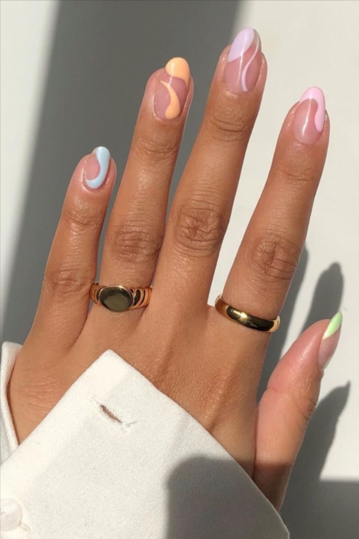 Еще один тренд лета 2021 года – маникюр с волнистыми линиями. Вы можете сделать прозрачное покрытие, а затем с помощью более насыщенного цвета нанести волнистые линии на каждый палец. Для этого можно использовать один цвет или несколько разных.
