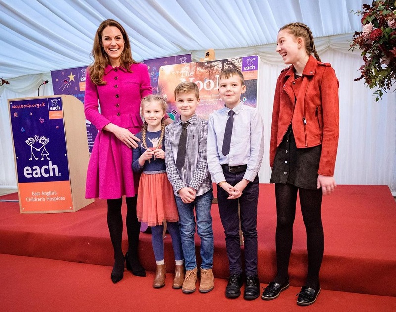 Также у герцогини Кембриджской много костюмов с юбками. Как, например, этот костюм цвета фуксии с коротким жакетом с рукавом три четверти и пышной юбкой в складку.
